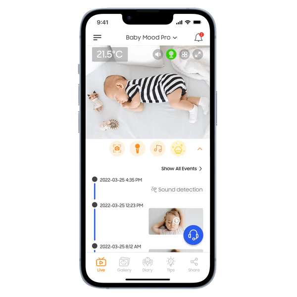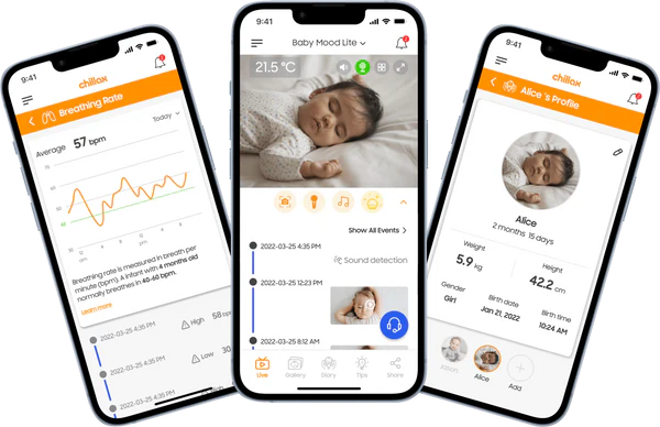 Emparelhe sua babá eletrônica com o aplicativo ChillaxCare para assistir à transmissão ao vivo de qualquer lugar. Crie um diário do bebê para acompanhar todos os marcos do seu desenvolvimento, compartilhe o acesso remoto com seus entes queridos e receba alertas quando sons ou movimentos forem detectados.