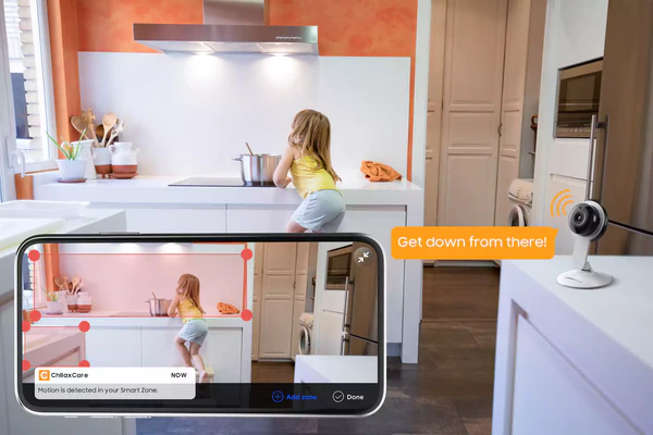 Configure Zonas Inteligentes no aplicativo ChillaxCare e receba notificações somente quando for detectado movimento nessas áreas. Configure Zonas Inteligentes ao redor de portas, janelas e em qualquer lugar que precise ser alertado.