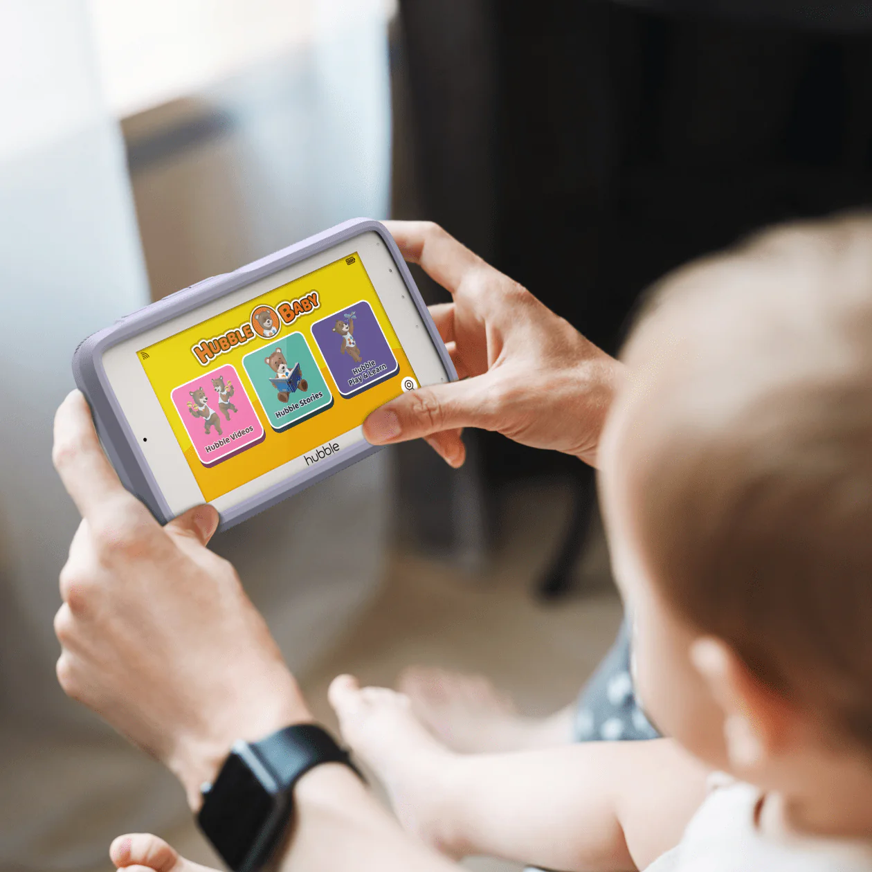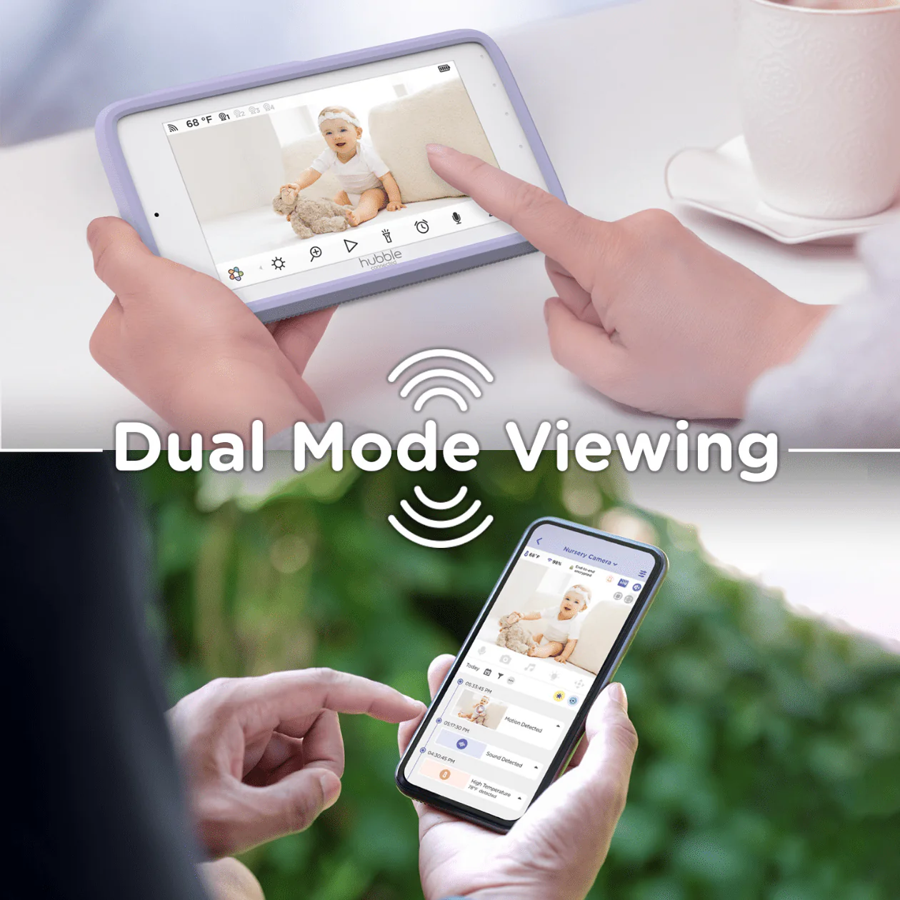 O monitor inclui Comunicação Bidirecional, um sensor de temperatura ambiente e visão noturna infravermelha. O monitor dos pais com tela touch de 5 polegadas oferece visualização local e também pode ser usada como um console de entretenimento para uma criança com jogos e vídeos pré-carregados. Os pais também podem acessar uma transmissão ao vivo por meio do aplicativo HubbleClub em seu dispositivo inteligente. O sistema fornece notificações em tempo real para movimento, detecção de som e temperatura ambiente.