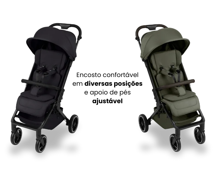 Encosto super acolchoado com várias posições, incluindo modo deitar totalmente plano, além de apoio para os pés ajustável em duas alturas. Assim, o bebê tem o máximo de conforto em qualquer situação, seja para tirar uma soneca ou acompanhar tudo ao redor durante o passeio.