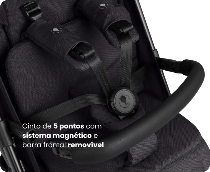 Exclusivo sistema de cinto de 5 pontos com fechamento magnético e barra frontal destacável tornam o uso seguro e prático. Indicado para crianças que já sentam sozinhas.